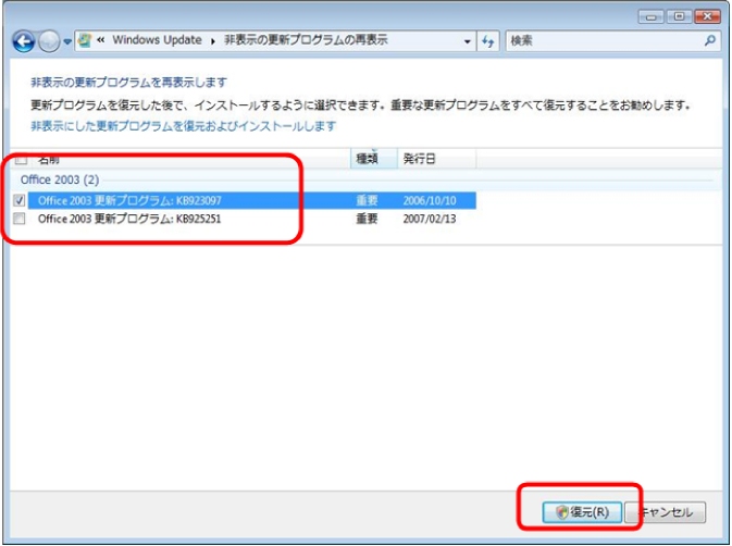 <2>[非表示の更新プログラム]の一覧が表示されるので、再表示したい更新プログラムのチェックボックスにチェックを打ち、[復元]ボタンを左クリックします。