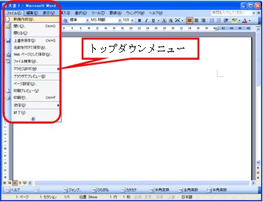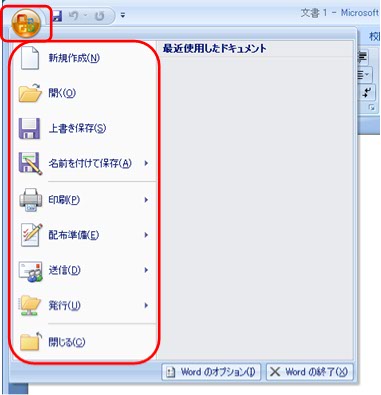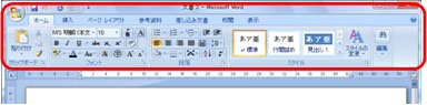 ウィンドウ左上にあるOfficeのロゴが入った丸いボタンが「Microsoft Office ボタン」です。クリックするとメニューが開き、「新規作成」や「開く」などの基本的な機能が利用できます。