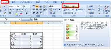 (1) 【ホーム】タブの【スタイル】グループ内の【条件付き書式】をクリックします。
