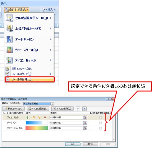 ※設定できる条件付き書式の数は無制限です。【ルールの管理】をクリックすると【条件付き書式ルールの管理で管理】が表示されるので設定したルールはここで管理できます。
