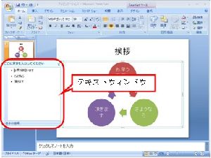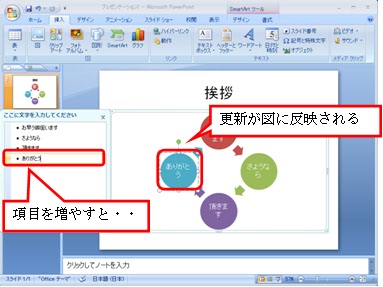 (3) SmartArtを挿入されたら、そこにテキストを入力します。テキストの入力では、図の脇に【テキストウィンドウ】が表示されるので、そこにテキストを入力していけば、自動的に図の中にテキストが入力されます。