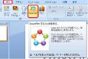 (1) 「SmartArt」を挿入するには、【挿入】タブの【図】グループ内の【SmartArt】をクリックして下さい