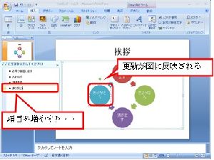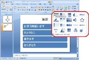 Office PowerPoint 2007では、図の扱いがより簡単になり、センスのいいプレゼン資料が作りやすくなっています。新機能の「SmartArt」では100種類以上の図が用意されており、自分が使いたい図が見つけられると思います。