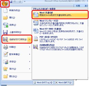(5)以前のOfficeで作成したファイルを残したまま、2007 Office system形式のファイルで作業したい場合は、【Office】ボタンをクリックし、【名前を付けて保存】を選択し【Word文書】をクリックして下さい。