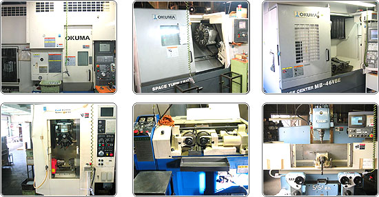 設備資金貸与制度を活用して導入した最新の設備左上からNC旋盤(ロボット付)、NC旋盤、マシニングセンター、 NCタレットセンター、転造機、NCフライス