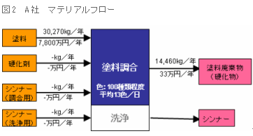 次の段階は、多くの資源・エネルギーを投入しているプロセスの詳細分析を行います。具体的に、ある金属製建材メーカーA社の事例を簡単にご紹介します(マテリアルフロー:図2)。A社では塗装工程の廃棄物が年間14.5トン発生し、処理費用は33万円かかっています。普通に廃棄物の処理費用を見ていると、この33万円までしか認識できません。