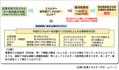 新しい省エネ法ではエネルギー使用量が企業全体で1,500kl(原油換算)であれば行政への届出等が必要となります。その測定期間は2009年4月〜2010年3月となっており、対象となる企業では今からエネルギー使用量を測定・記録する必要があります。