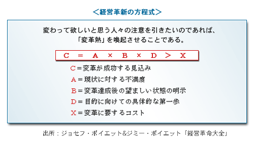 この計算式の意味は、従業員に変革意識を求めるのであれば、(A)変革の必要性を理解(納得)させ、(B)変革が成し遂げられた暁には、状況がどれだけ改善されるかというビジョンを示し、(D)変革プロセスの早い段階で前向きな効果を生み出すことによって、何をやろうとしているかを示す必要があります。(当然のことながら、これらの中で最も重要なのは、組織に変革の必要性を気づかせることです。)   (X)こういった取り組みに要するコストよりも、大きな成果が期待できれば(C)変革(経営革新)が成功する見込みは高いということを表しています。