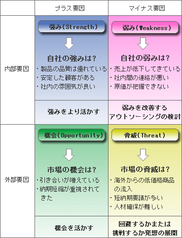 [V] 簡易な自社の「現状分析」の実施は、「SWOT分析」を行って下さい。これは、分析要因を「内部・外部」の要因に分け、更に 内部の要因を 「強みと弱み」に分け、