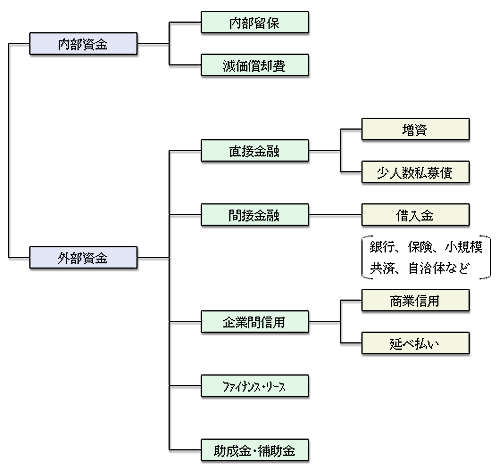 資金調達は、事業活動を通じて自ら資金を生み出すか、または、外部から資金を調達するかです。これによって、内部資金と外部資金の二つに大別されます。