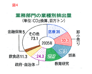 業務部門の業務別排出量は図4に示すごとくで、政府はサービス業・学校・病院などに自主的な削減目標を作るよう求める方針を、建造物の省エネの規制も2000u以下の物件・既存の物件への拡大の方針を固めたようです。