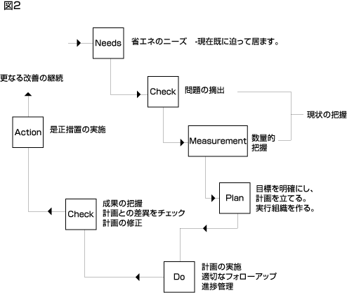 移動量を下げる。エア圧力・吐出量を下げる。風圧・風量を下げる。水圧・流量を下げる。回転数を下げる。損失を下げる(効率を上げる)。速度を下げる。使用量を下げる。温度を下げる。運転時間を短くする。過剰照明・過剰空調を下げる。空調負荷を下げる。空調範囲を狭くする。工程を短くする。仕損を下げる。