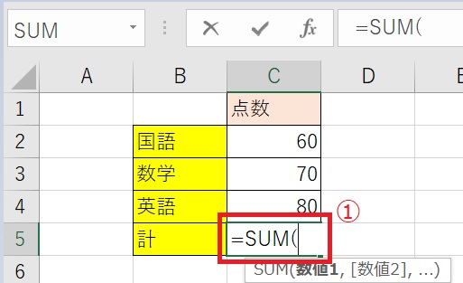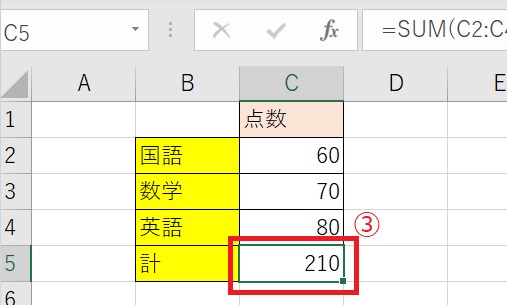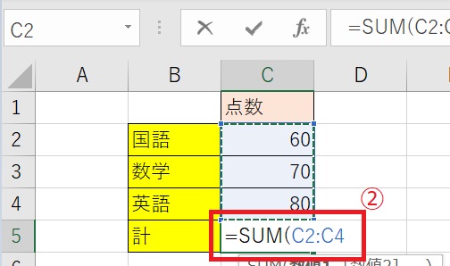 ②合計したいセル範囲であるC2~C4を範囲設定します。