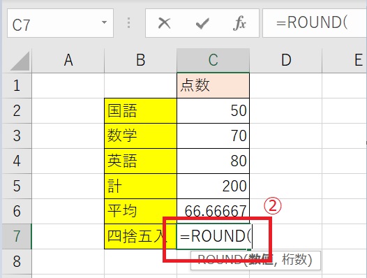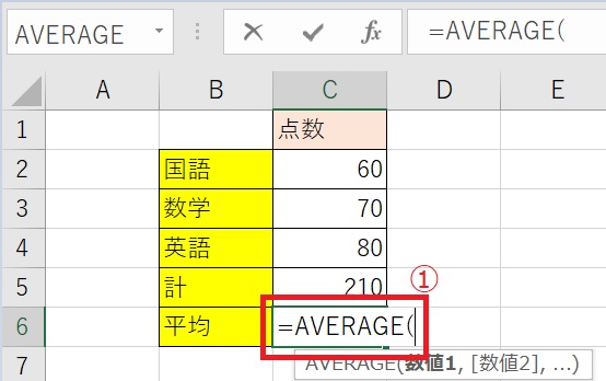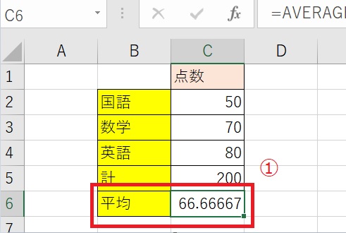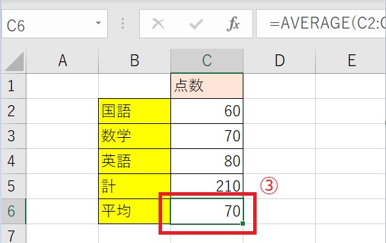 ①国語、数学、英語3教科の平均点数を求めるため、 C6セルにAVERAGE関数を入力します。