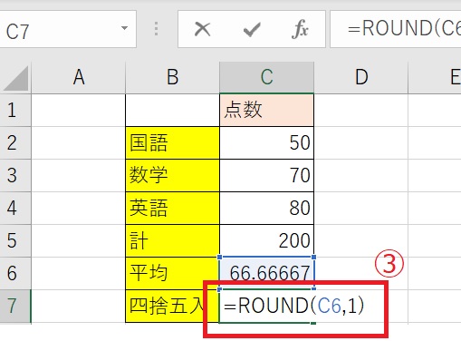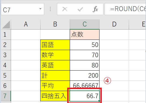 ②C6のセル値をROUND関数で小数点第一位まで四捨五入します。