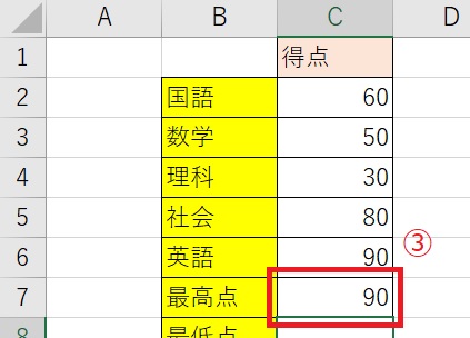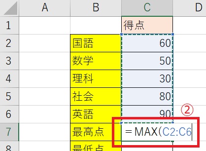 ②C7セルに「=MAX(C2:C6)」と入力しました。