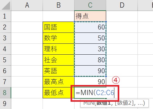 ④C8セルに「=MIN(C2:C6)」と入力しました。