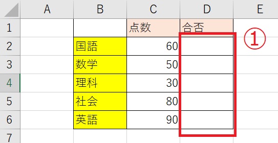 ①テストの合否を、IF関数を使って確認します。60点以上なら合格です。