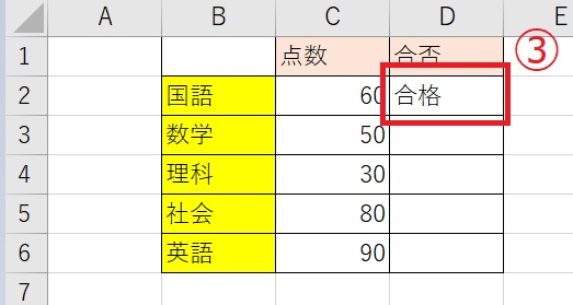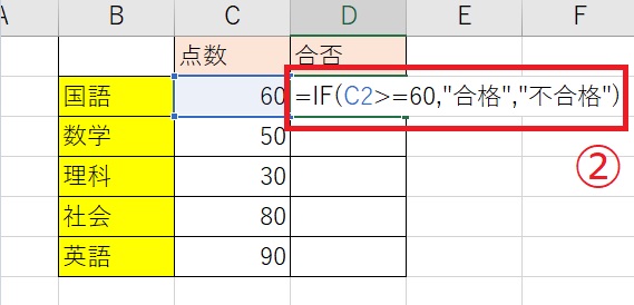 ③C2に入力されている国語の点数は60点の為、「合格」と表示されました。