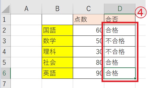 ④D2セル以下のセルにも同様の式を入力した結果、すべての科目の合否を確認することができました。