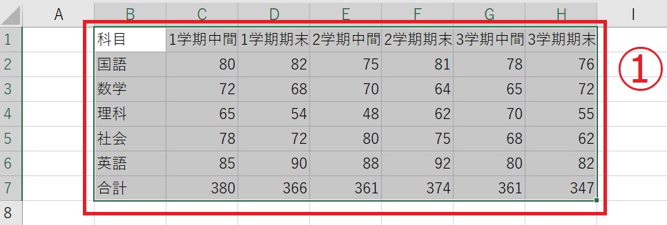 ①表にしたい範囲をドラッグします。