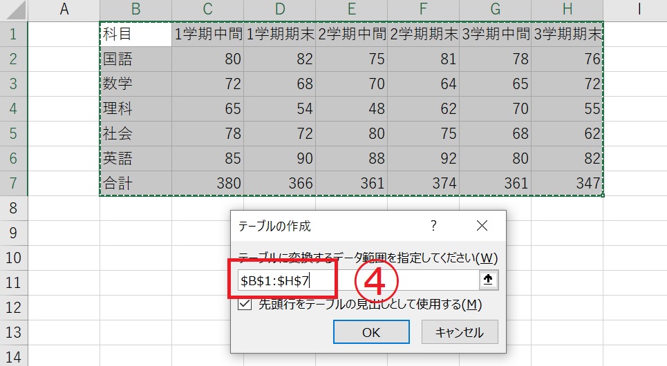 ④「テーブルの作成」画面ボックスが立ち上がります。