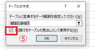 ⑤先頭行を見出しとする場合は「先頭行をテーブルの見出しとして使用する」のチェックを入れてOKボタンを押します。