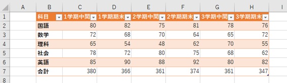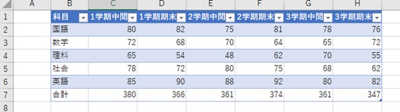 今回は学期ごとに定期試験5科目の合計点が分かる表を作成していきます。
