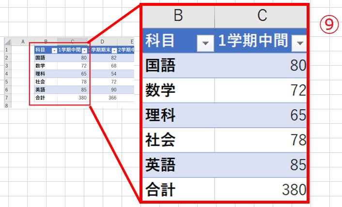 ⑥見やすくデザインされた表になりました。