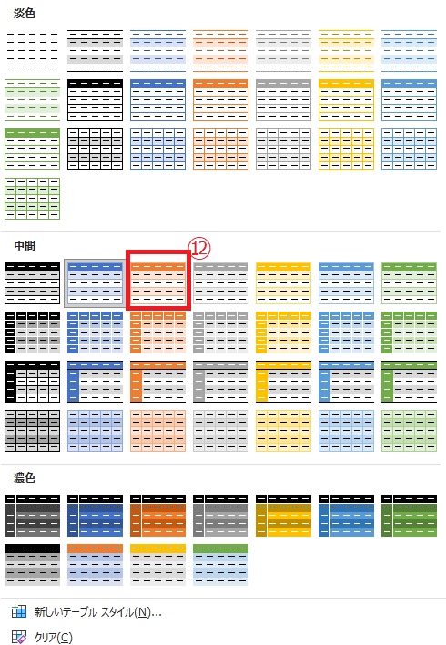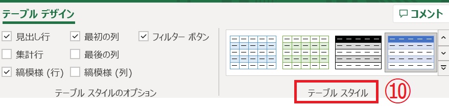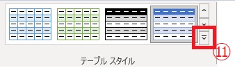 ⑩「テーブルスタイル」から表のデザインを変更します。