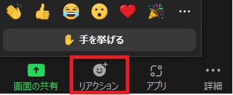 挙手などのリアクションをする場合は「リアクション」ボタンをクリックして反応の種類を選びましょう。