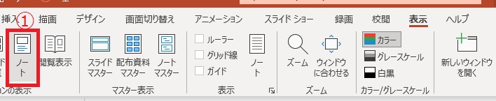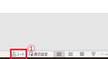 ①ノートペインは PowerPoint の画面下部にある「ノート」をクリックします。