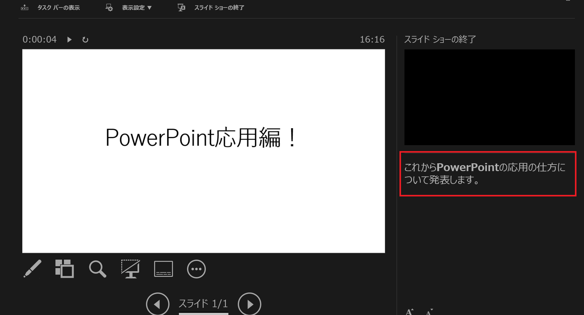 発表者のPC画面にノートが表示されます。プロジェクター画面にはスライドのみが表示されるので、プレゼンテーションを見ている人からはノートの内容が分かりません。