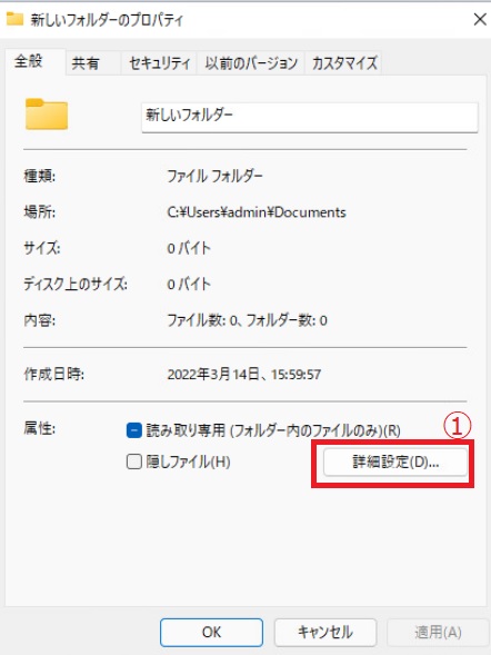 ①ファイルを右クリックして「プロパティ」を選択し、「詳細設定」ボタンを押します。