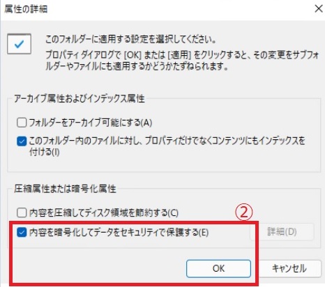 ②「内容を暗号化してデータをセキュリティで保護する」にチェックを入れて「OK」を押します。