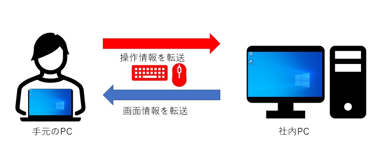 このような画面転送方式では操作しているのは手元のPCですが、実際の動作を行うのは社内PCになります。
