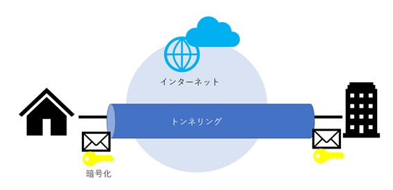 仮想的な専用線を設定する為に、2つの拠点や機器をつなぐための仮想的なトンネルを作ります。これを「トンネリング」と言います。