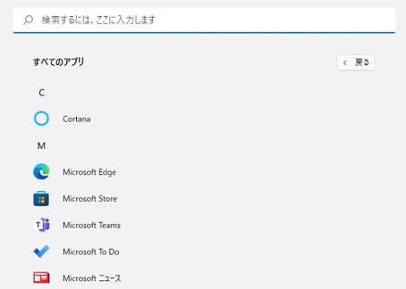 「すべてのアプリ」をクリックしてみました。ピン止めされていない他のアプリが表示されました。アルファベット・五十音順に並んでいます。