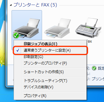 ここでお使いのプリンターを右クリックした時、「通常使うプリンターに設定」にチェックが入っていない場合、プリンター場動作しません。