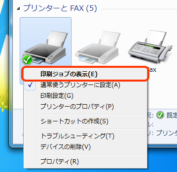 「デバイスとプリンター」の中からお使いのプリンターを右クリックし、「印刷ジョブの表示」を選択してください。
