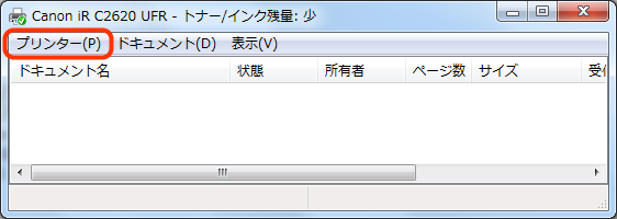 印刷ジョブ画面メニューの「プリンター」から「すべてのドキュメントの取り消し」を選択すると、印刷ジョブを取り消すことができます。