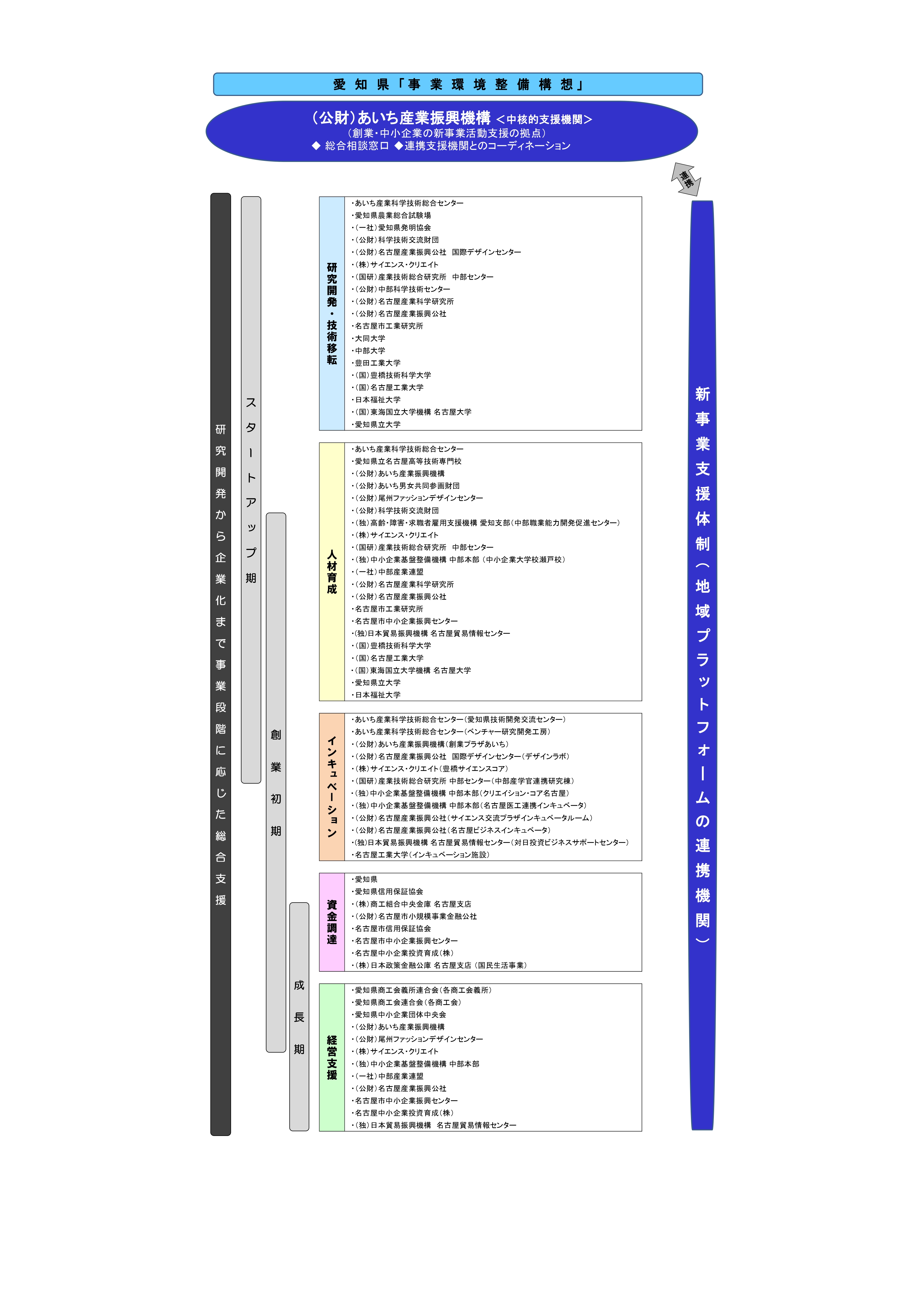 「あいち新事業活動促進連携会議」は、中小企業新事業活動促進法により策定された愛知県の「事業環境整備構想」に基づき平成17年6月に設置され、愛知県内の「新事業支援機関」相互の連携を図るため、連絡調整、情報交換等を行っています。 「新事業支援機関」は、地域に蓄積された人材、技術、資金、情報等の産業資源を活用して中小企業の新事業活動を支援する機関で、産業支援機関、経済団体、研究機関、大学等の40機関に及び、新事業支援体制(地域プラットホーム)が整備されています。公益財団法人あいち産業振興機構は、地域における支援機関の中心となり支援事業を実施する中核的支援機関に認定され、新事業活動支援の総合窓口として機能のほか、「あいち新事業活動促進連携会議」の運営を行っています。