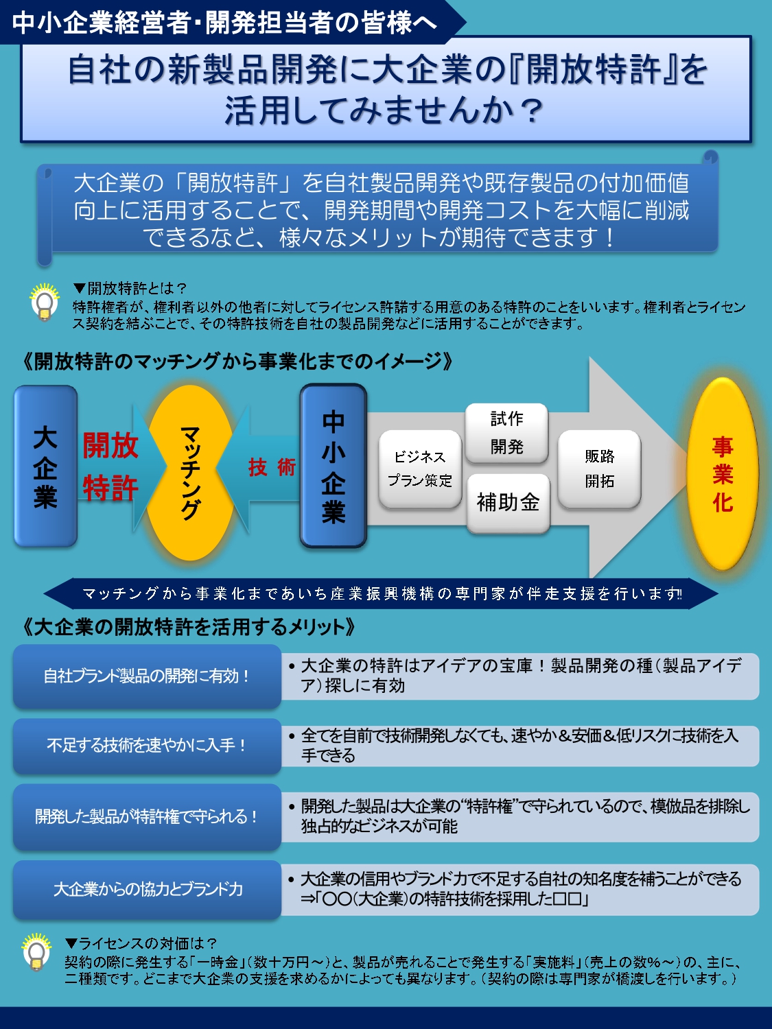 大企業や大学、公的支援機関等が保有する「開放特許(※)」を活用し、中小企業の新規事業や新製品開発の支援を行います。